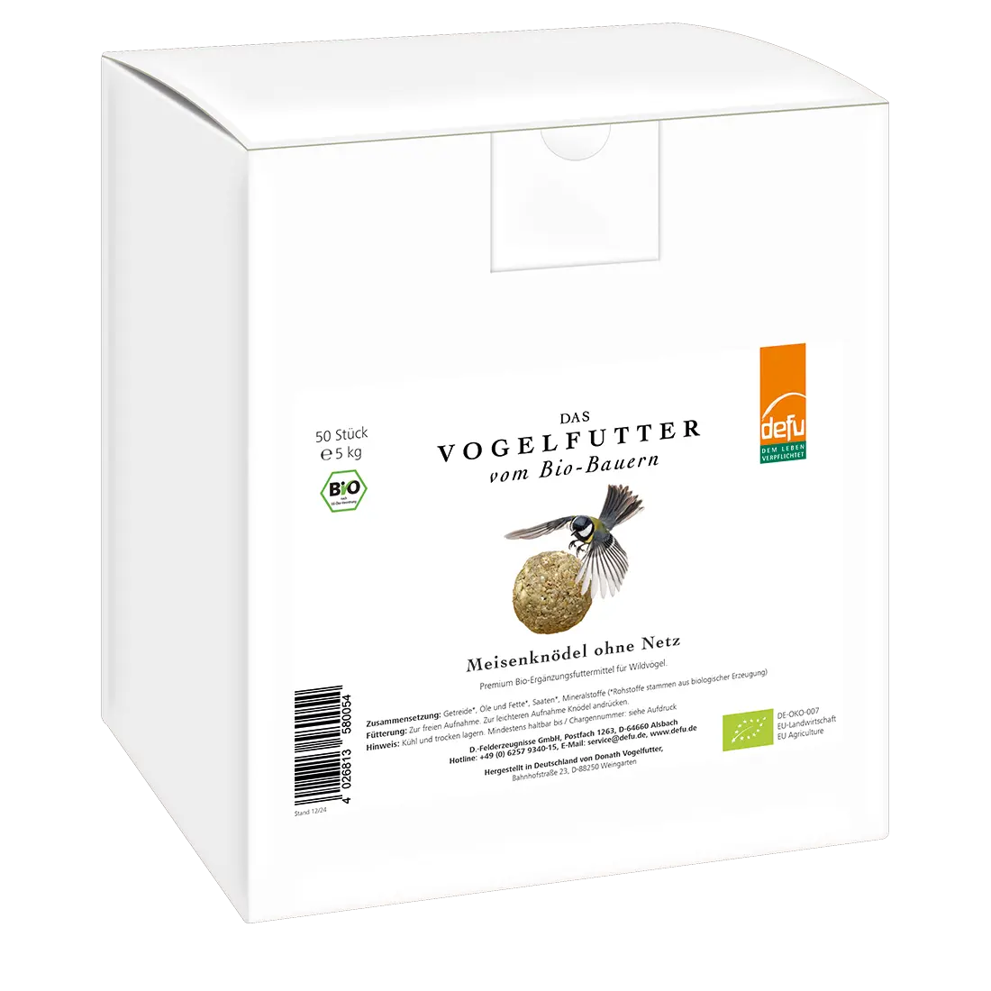 Ergänzungsfuttermittel für freilebende Vögel (Weich- und Körnerfresser). Die praktische Vorratsgröße mit 50 handgefertigten Bio-Meisenknödeln im umweltfreundlichen Karton.