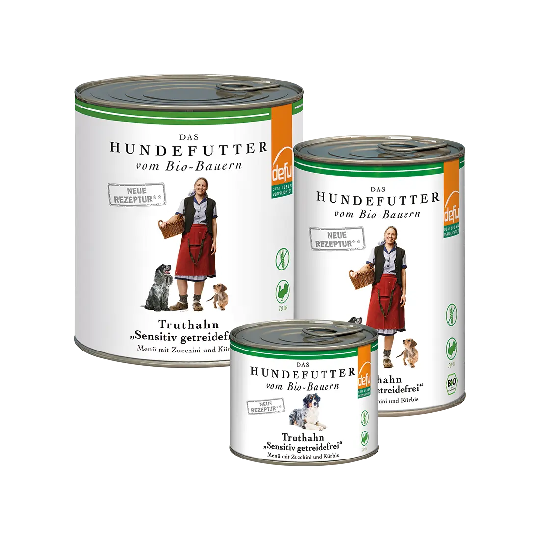 Unser Hunde-Menü Truthahn ”Sensitiv getreidefrei“ ist eine schmackhafte Komposition aus 70 % saftigem Truthahn und den besten Feldfrüchten. Zucchini und Kürbis liefern wichtige Vitamine und Ballaststoffe für ein fröhliches Hundeleben. Die Rezeptur enthält nur eine einzige tierische Proteinquelle. Damit ist sie ideal geeignet als tägliches Futter für alle ausgewachsenen Hunde und für Hunde, die aus ernährungsphysiologischen Gründen, wie zum Beispiel Unverträglichkeiten und Allergien möglichst schonend ernährt werden sollten.