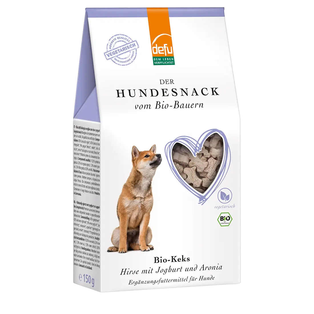 Kleine knusprige Hundekekse (vegetarisch) in süßer Hundeform. Mit starken Nährstoffen wie Bio-Hirse, Bio-Reisvollkorn, Bio-Frischjoghurt, Bio-Bienenhonig und Bio-Aronia.Schmackhafte Leckerlis für kleine Belohnungen zwischendurch.