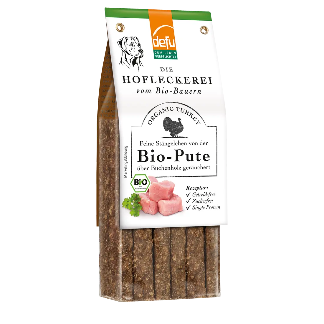Unsere Hofleckereien von der Bio-Pute bestehen aus 96,5 % Putenfleisch und werden in der Räucherkammer mild über reinem Buchenholz geräuchert und veredelt. Sie sind getreidefrei, zuckerfrei, Single Protein und besonders bekömmlich.
