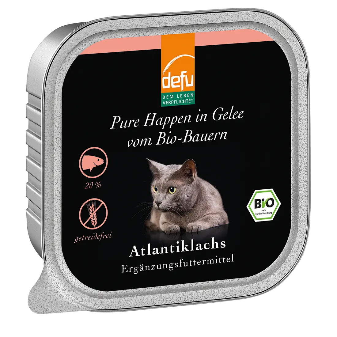 Saftige Fleisch-Happen aus bestem Bio-Fleisch und edlem Bio-Atlantiklachs in feinem Gelee aus Johannisbrotkernmehl, für besonders anspruchsvolle Feinschmecker.