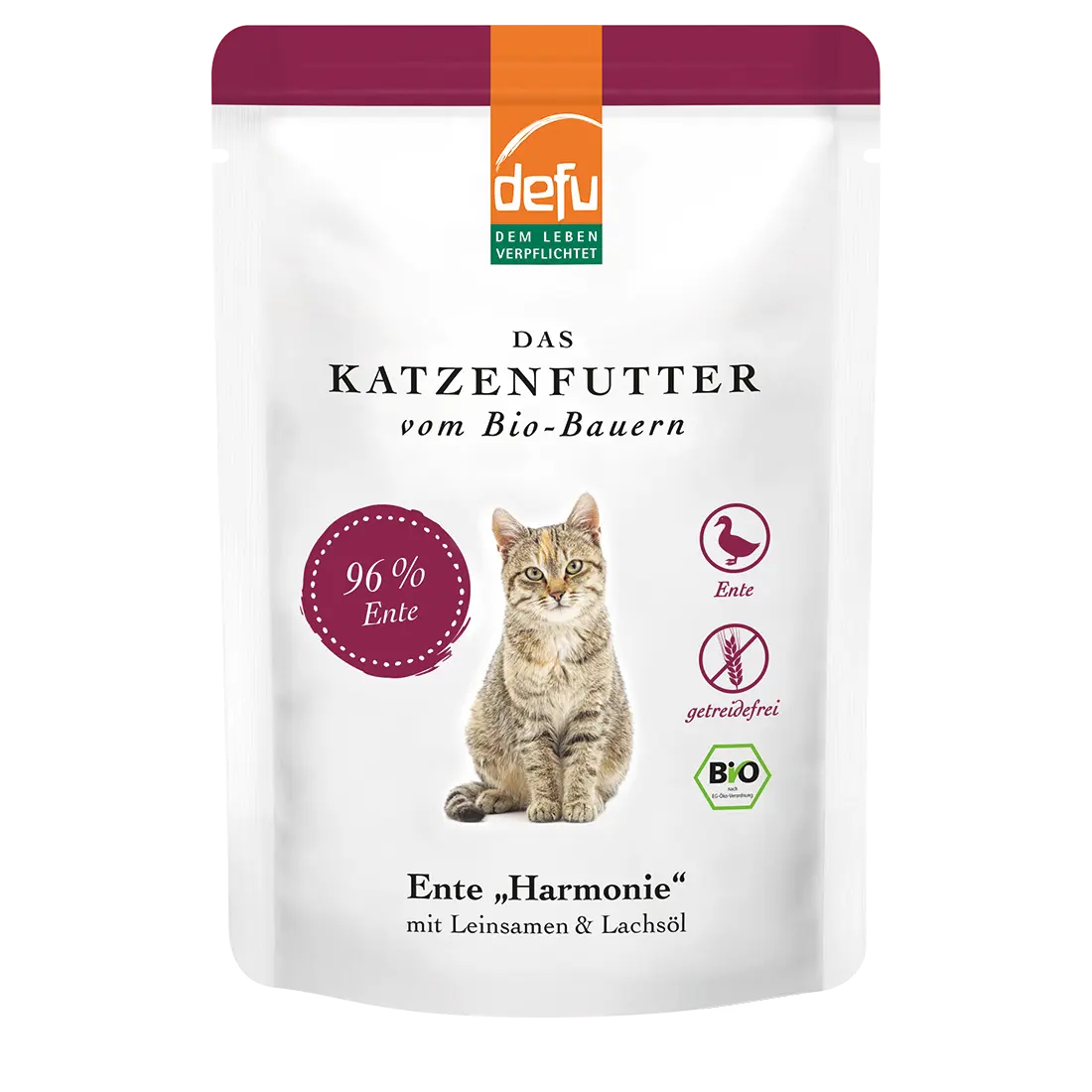 Premium-Alleinfuttermittel für Katzen in Bio-Qualität. Verfeinert mit Leinsamen und edlem Lachsöl.