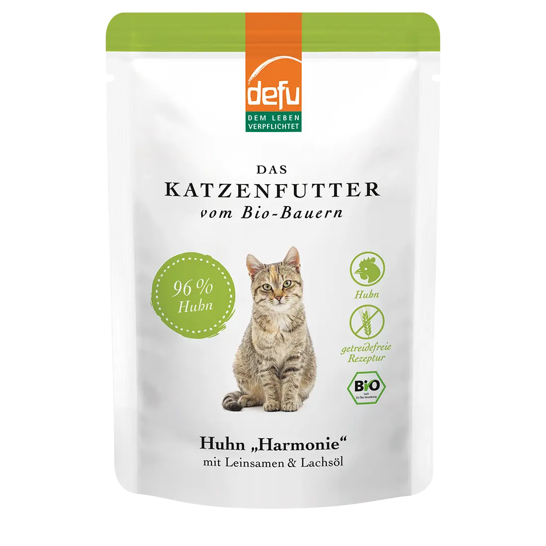 Premium Bio-Alleinfuttermittel für Katzen. Verfeinert mit Leinsaat und edlem Lachsöl.
