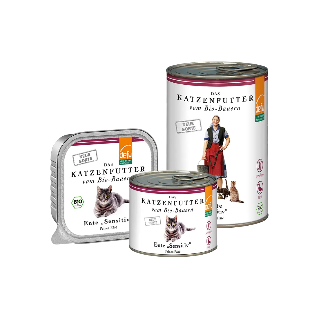 Premium-Alleinfuttermittel in Bio-Qualität für erwachsene Katzen. Feines Pâté mit Ente, Kürbis und Sonnenblumenöl.