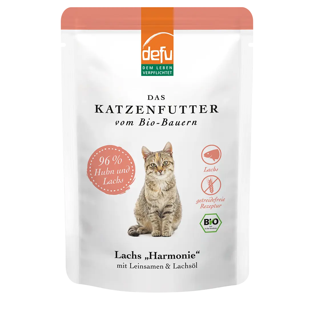 Premium-Alleinfuttermittel in Bio-Qualität für Katzen. Verfeinert mit Leinsaat und edlem Lachsöl.