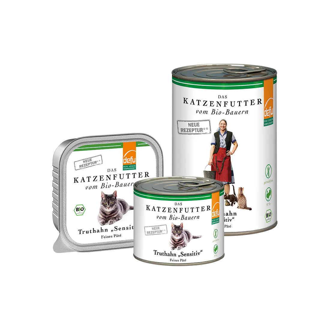 Ihre Katze liebt die Abwechslung. Servieren Sie dem kleinen Feinschmecker doch mal unsere Pâtés “Ente Sensitiv“, “Schwein Sensitiv“, “Gans Sensitive“, “Huhn Sensitive“, “Lachs Sensitive“, “Lamm Sensitive“ und “Rind Sensitive“.
