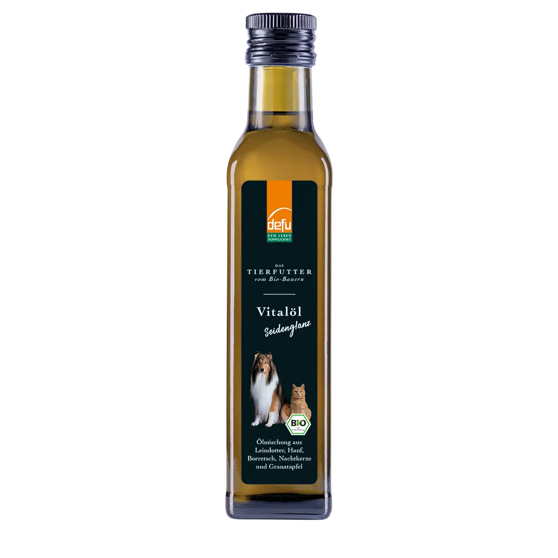Unser defu Vitalöl Seidenglanz ist eine einmalige Mischung aus verschiedenen hochwertigen Bio-Ölen für Hunde und Katzen. Die Grundlage dieser erlesenen Rezeptur ist Leindotteröl mit 59 % und Hanföl mit 30 %. Hinzugefügt werden 4 % Nachtkerzenöl, 4 % Borretschöl und 3 % Granatapfelkernöl.